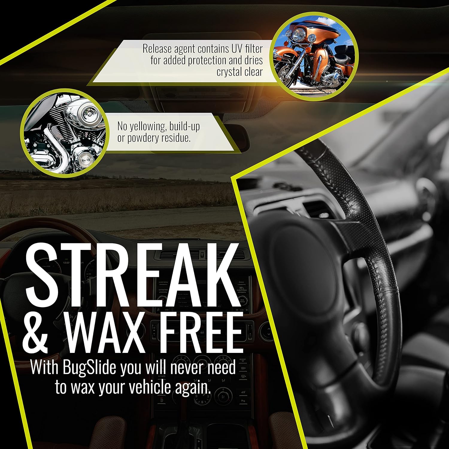 - Streak and Wax-Free – With Bugslide’s car cleaner, you will never need to wax again. Applied and paired best with the included microfiber cloth to wipe clean, the release agent in the spray bottle contains a UV filter for added protection and dries crystal clear with no yellow tint, film, build-up or powdery residue.