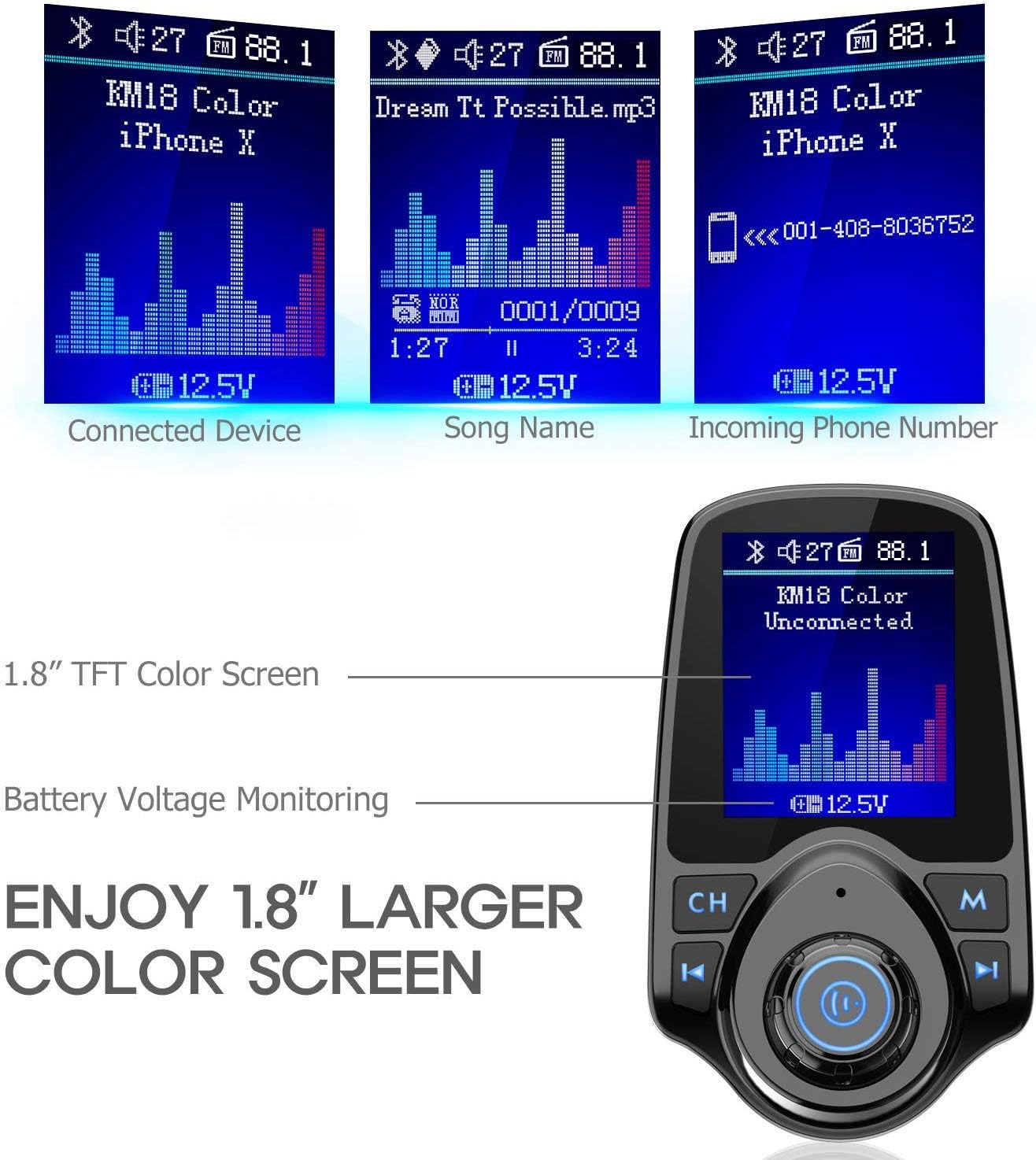 - Upgraded Version of Classic KM18: New KM18 Upgraded with 1.8” TFT color display screen, offers a wider visual interface for more information, such as incoming phone number, track name, FM frequency, battery voltage, Bluetooth connected device and more.