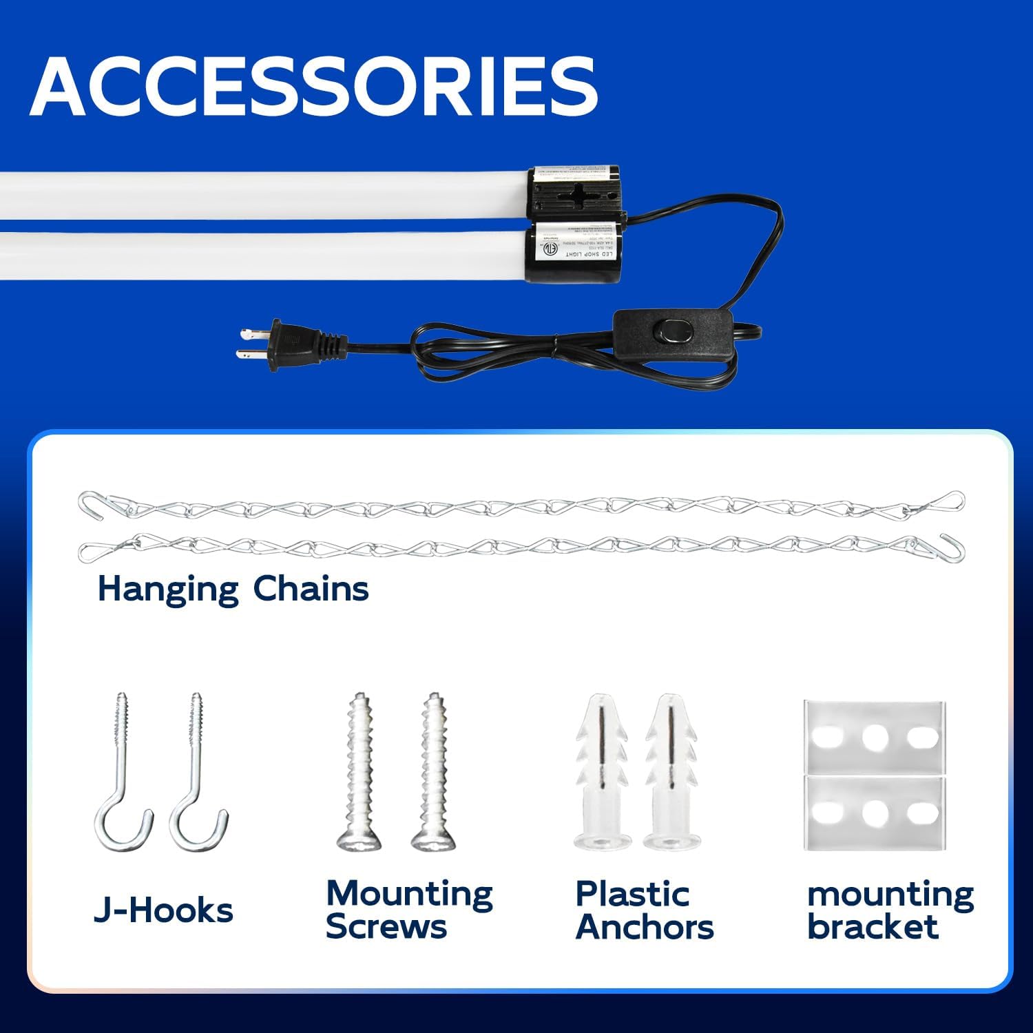 - ✅ Easy Installation - Plug & Play. Come with 59" power cord with on/off switch and other small accessories. You can hanging it with the included hanging chains or directly mounted to the ceiling with the included mounting screws.