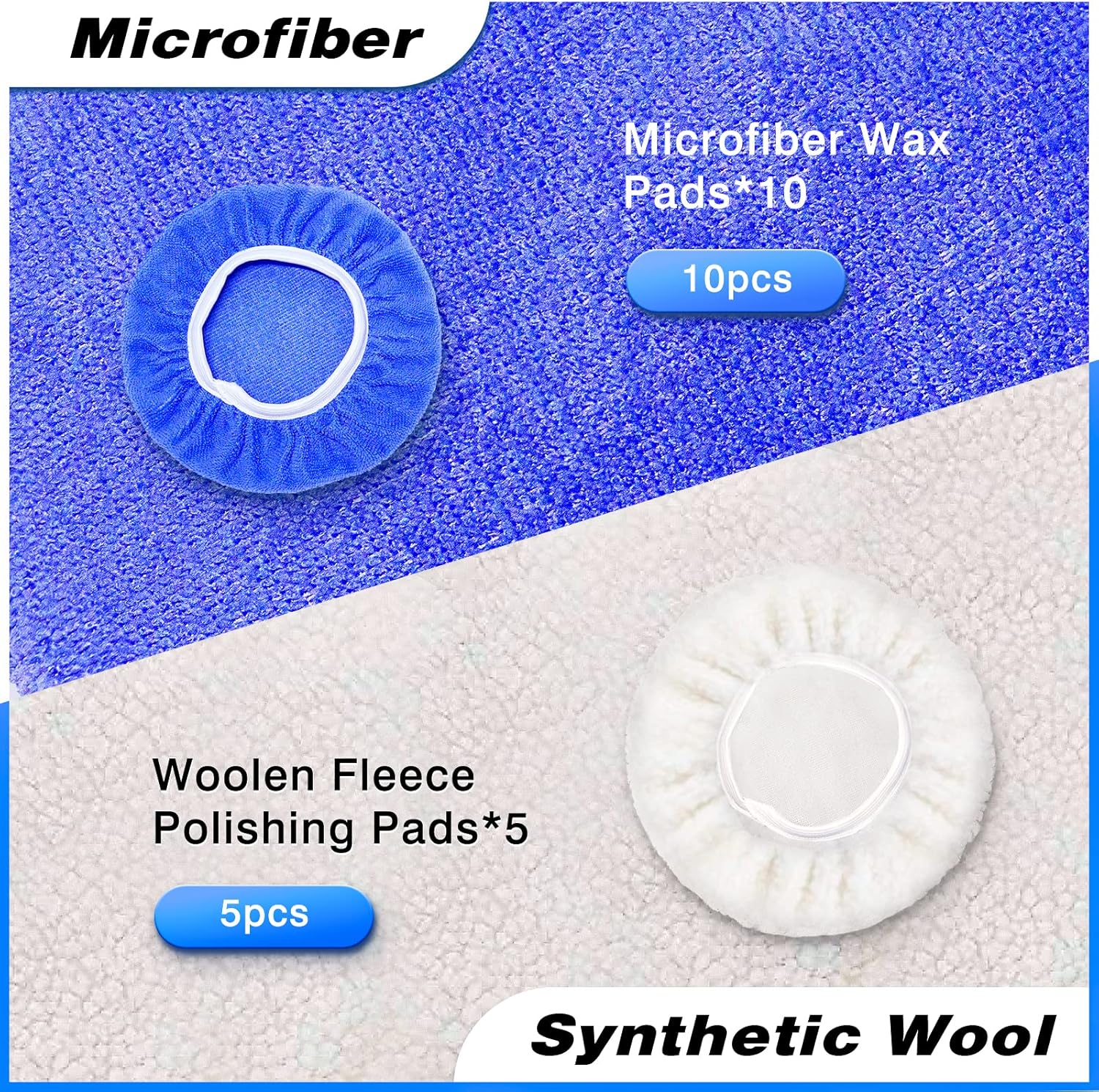 - [ 15Pcs Polishing Bonnets ]: 10Pcs blue microfiber wax pads and 5Pcs white Woollen fleece polishing pads, which can adsorb dust and micron particles effectively, achieve waxing, cleaning, and polishing function, soft material, not to hurt the paint.