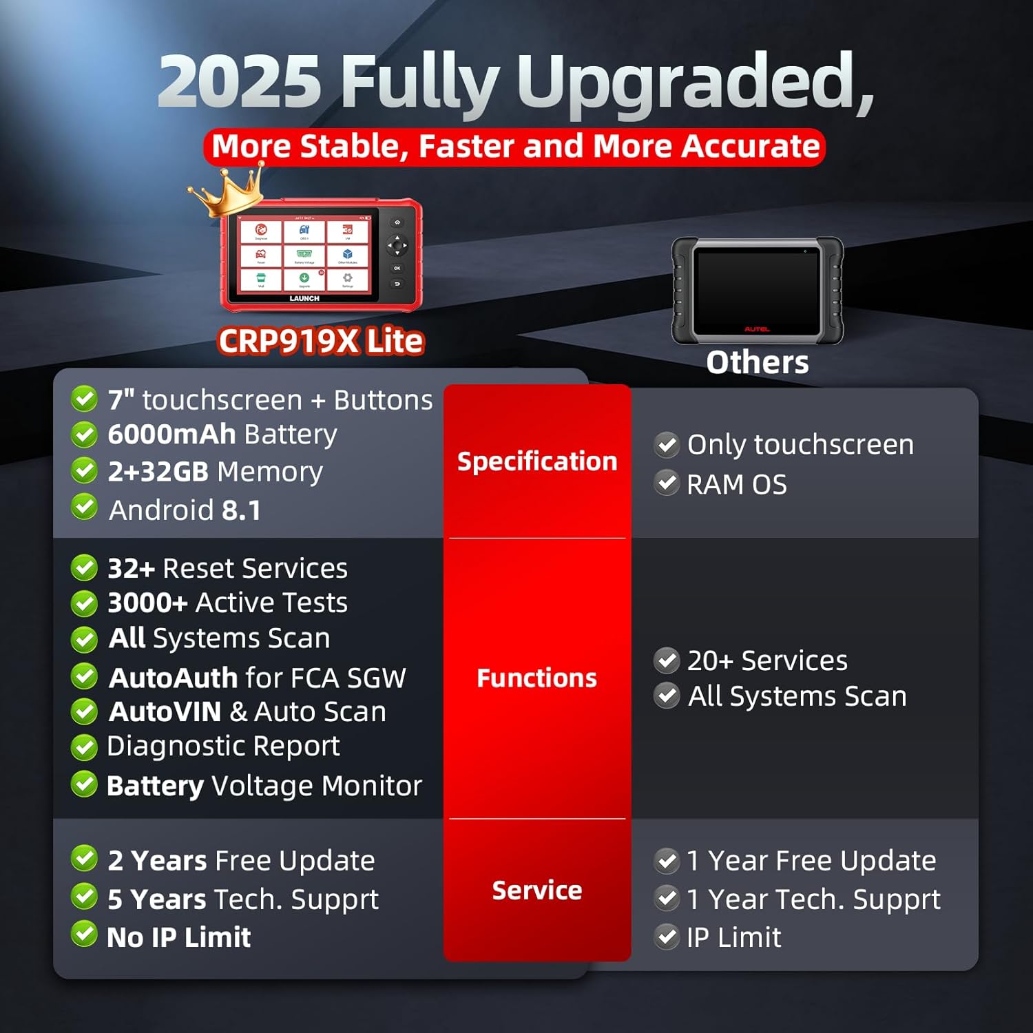 - 🥇【32+ Reset Services, Relearns, Calibration, Adaptations】: LAUNCH CRP919X Lite car diagnostic scanner provides 32+ competitive service functions to make your repair/maintenance more user friendly, such as Oil Reset/ SAS Reset/ EPB Reset/ BMS Reset/ ABS Bleeding /Sunroof Reset/Suspension Reset/ Gearbox Reset/ AFS Headlamp Reset/ Injector Coding/Gear Learning/TPMS Reset/Throttle Adaptation, etc. Note: These functions vary by car models and years. Check compatibility firstly.