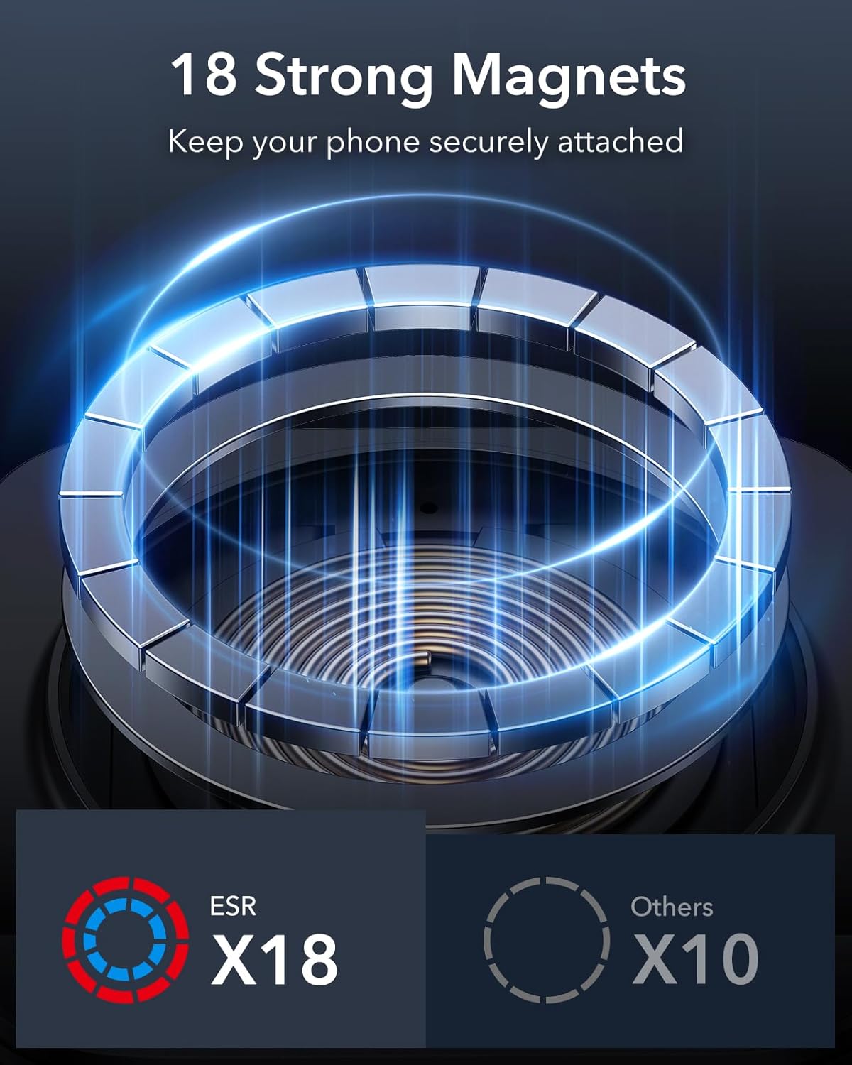 - Faster and Easier Charging: intelligent heat management enables you to charge at speeds nearly identical to official MagSafe chargers; 18W QC adapter required (not included); Compatibility: only for iPhone 16/15/14/13/12 series, Galaxy S25 Ultra/S25 +/S25 with a magnetic case; recommended to use with official or ESR magnetic cases; not compatible with Motorola, OnePlus, and Google phones