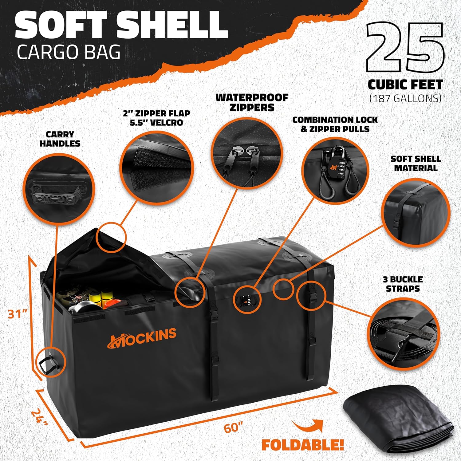 - Weatherproof Truck Bed Cargo Bag : Measuring 60"x24"x31", the Mockins Hitch Mount Cargo Carrier Bag delivers 25 cubic Ft. of roomy hitch storage . Crafted from abrasion-resistant vinyl, this waterproof cargo bag for hitch carrier stands up to all weather elements. Equipped with waterproof zippers under a 2" flap with 5.5" Velcro closures, these vehicle soft-shell carriers keep your belongings dry. Its robust seams resist rips, making it the ideal car hitch cargo carrier bag for long journeys.