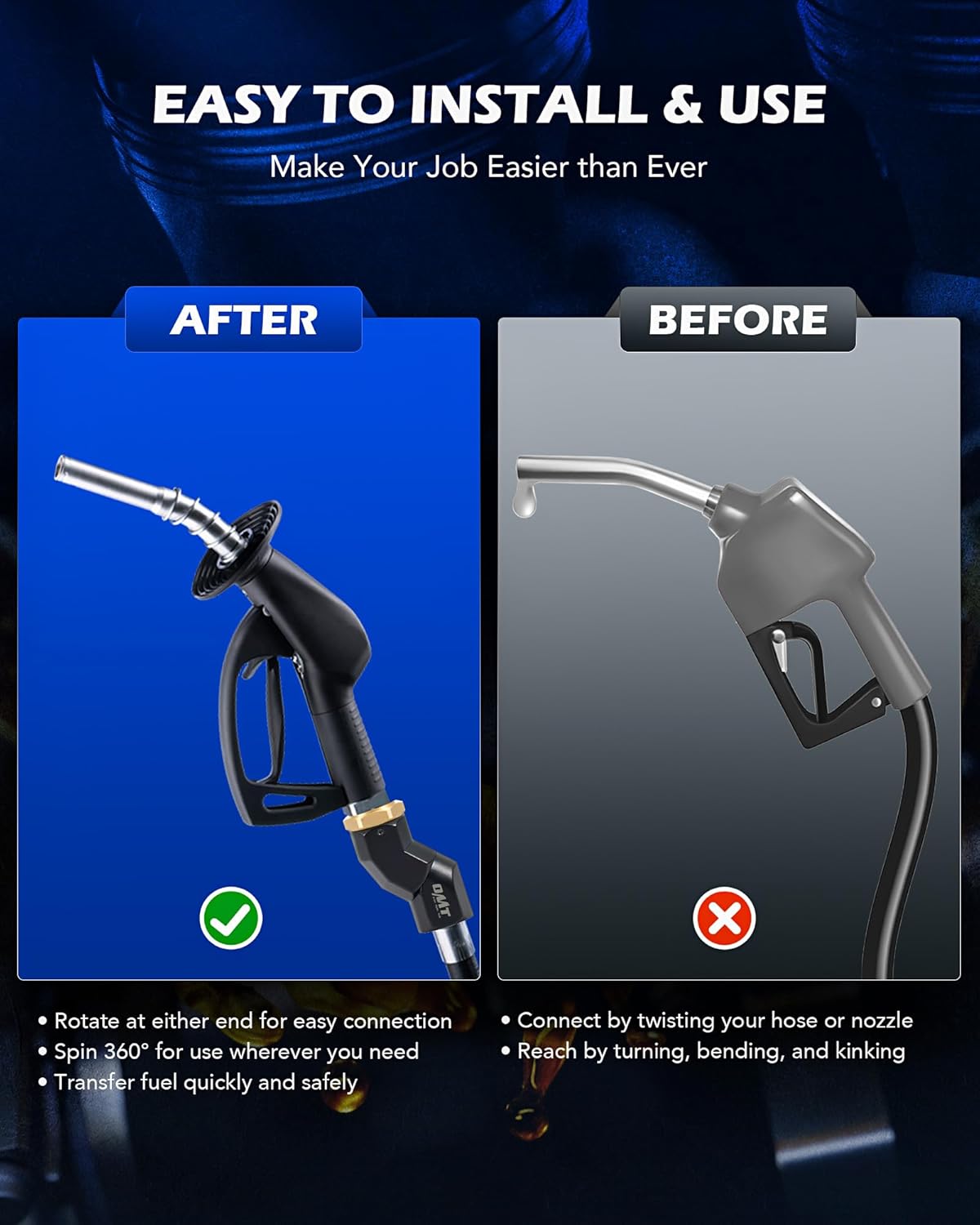 - MULTI-PLANE ROTATION: This 360 degree fuel hose swivel set from Orion Motor Tech allows you to get the perfect angle, filling your tank or vehicle with greater safety and convenience