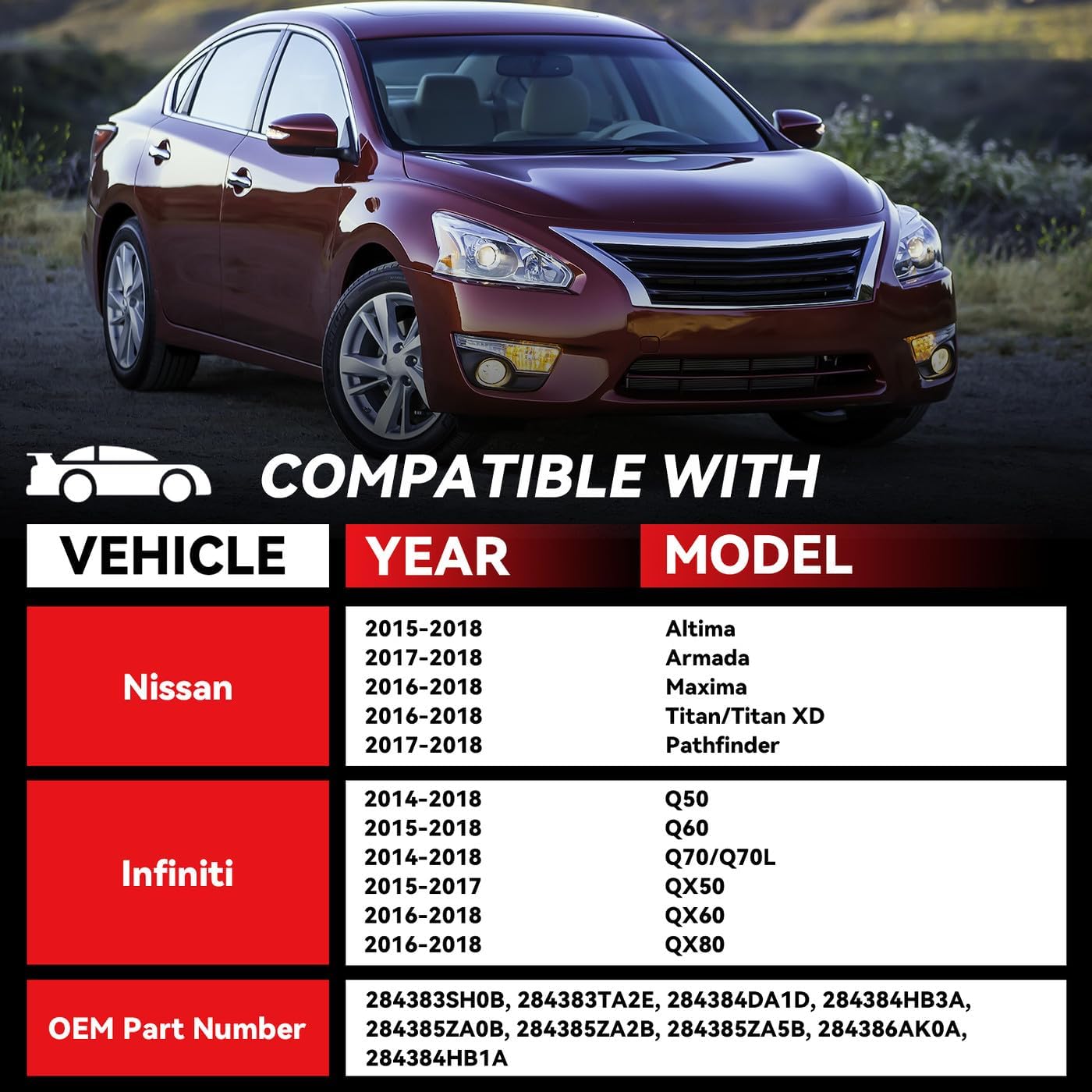 - [Fitment Guide]: Compatible with Nissan 2015-2018 Altima, 2017-2018 Armada, 2016-2018 Maxima, 2016-2018 Titan/Titan XD, 2017-2018 Pathfinder,Infiniti 2014-2018 Q50, 2015-2018 Q60, 2014-2018 Q70/Q70L, 2015-2017 QX50, 2016-2018 QX60, 2016-2018 QX80