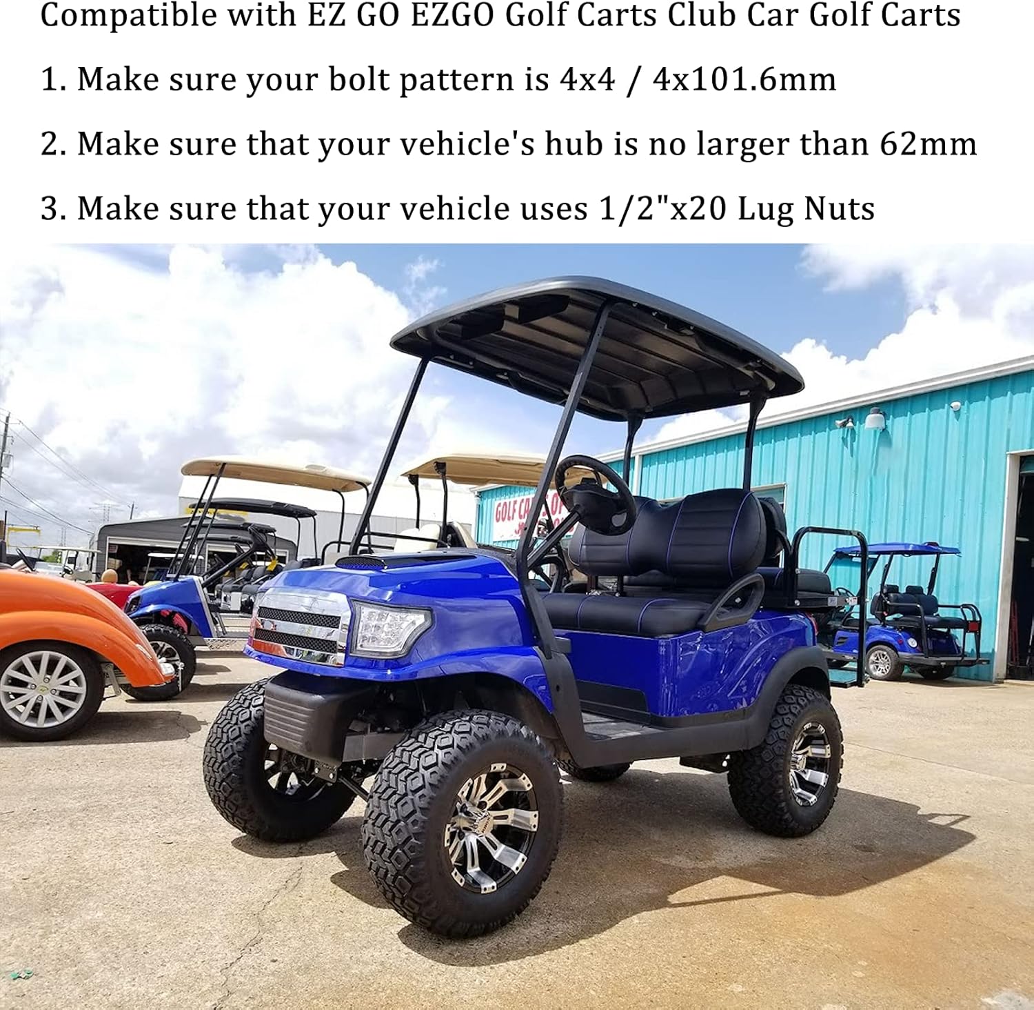 - ✔ Wheel Spacers Compatible with Golf Cart 4x4", 4x101.6, 4x100 Bolt Pattern EZ GO EZGO Club Car Golf Carts and ATV vehicles. (Vehicle hub studs and lug nuts must be with 1/2"-20 1/2x20 1/2"x20 thread pitch)