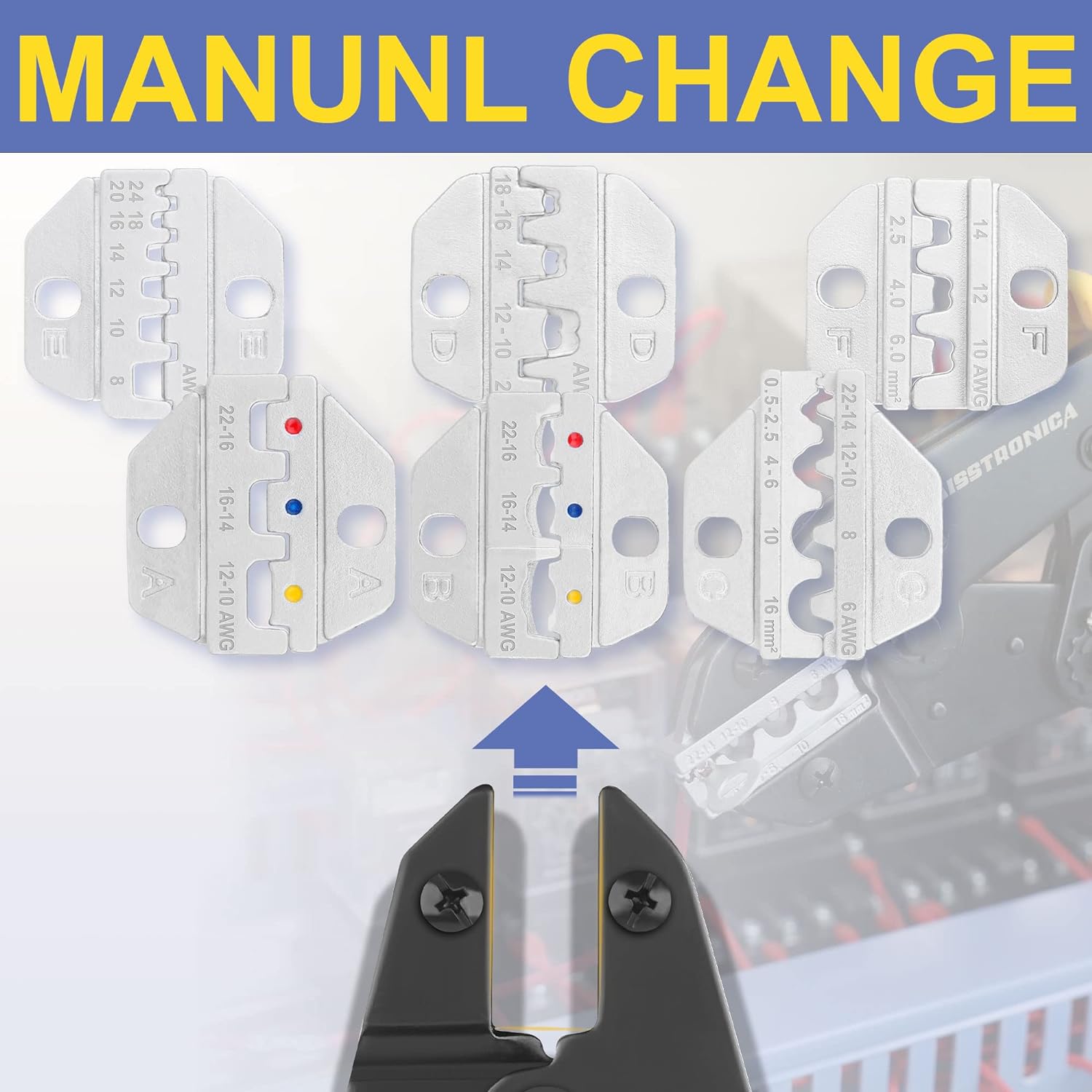 - Choose Without Barriers-Your equipment should never hold you back; When you need to change different wire connectors,the AWG-marked chrome-plated crimp dies offer you 6 options including heat shrink connectors,Insulated and nylon wire terminals,Non-insulated terminals,Insulated cable-end sleeves,open barrel terminals and solar connectors.Easy to operate, no confusion!