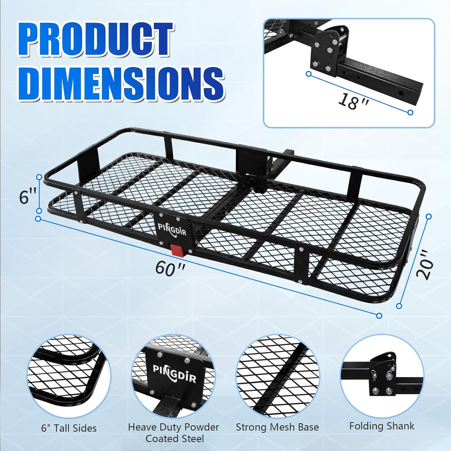 - Sturdy and durable :The hitch cargo basket is made of light weight and high strength steel tubing. Powder coated to resist rust ,hitch rack Can carry up to 500 lbs.