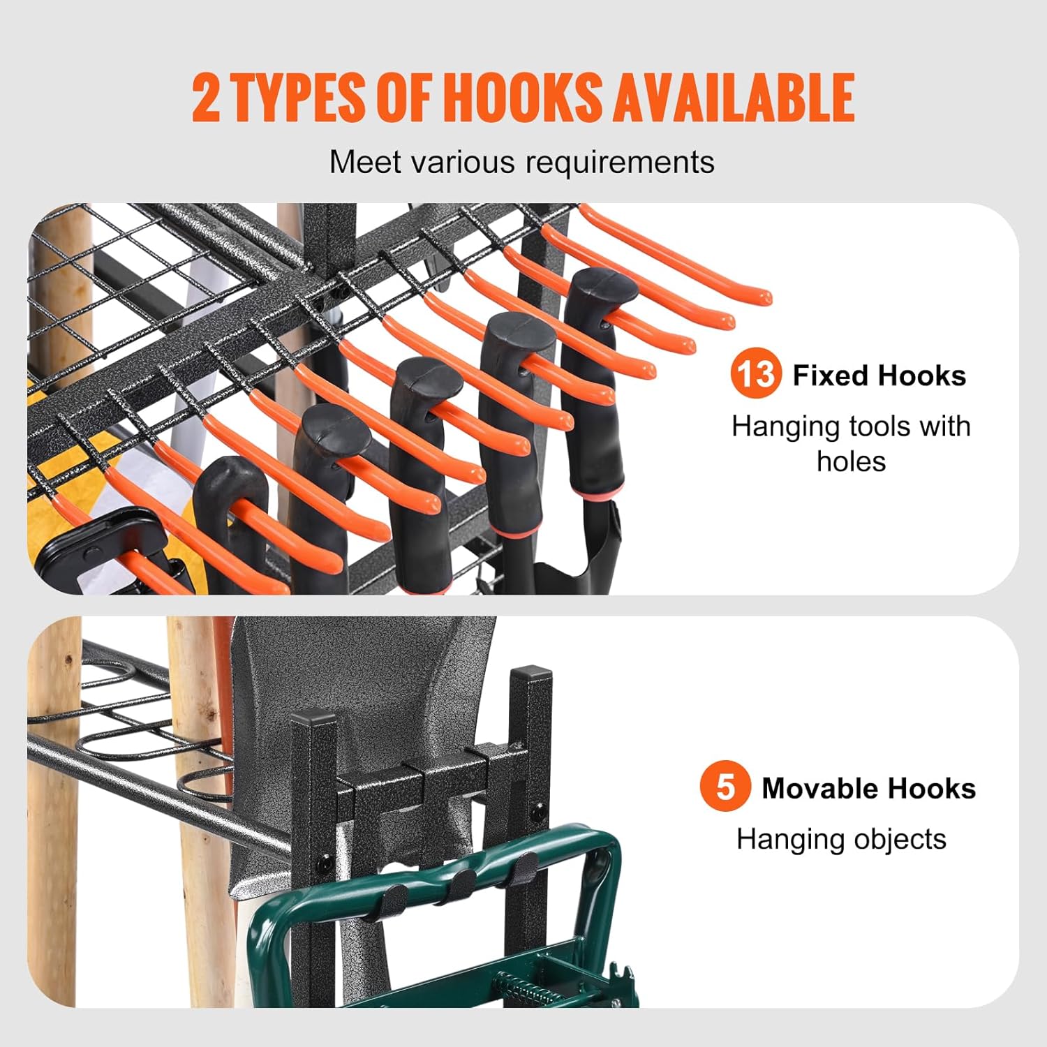 - Hooks That Hold More: Say goodbye to messy spaces with this garden tool organizer for garage. Our fixed and movable hooks are perfect for everything from wire cutters to trimmers. Plus, adjustable feet mean you're set, even on uneven ground.