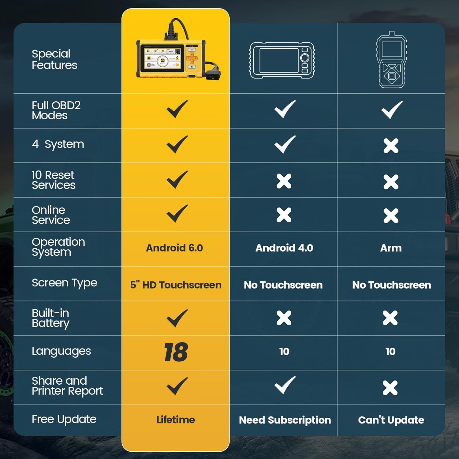 - 【Advanced Hardware】Dollarfix DF65 Obd2 Scanner Diagnostic Tool is Equipped With Cpu Mt6580(Cortex-A7 1.3Ghz 4 Cores),2G Ram And 32G Rom,3150mah Battery,5" Large Hd Touchscreen,18 Languages ,Android 7.0 And Update Online Free Lifetime.