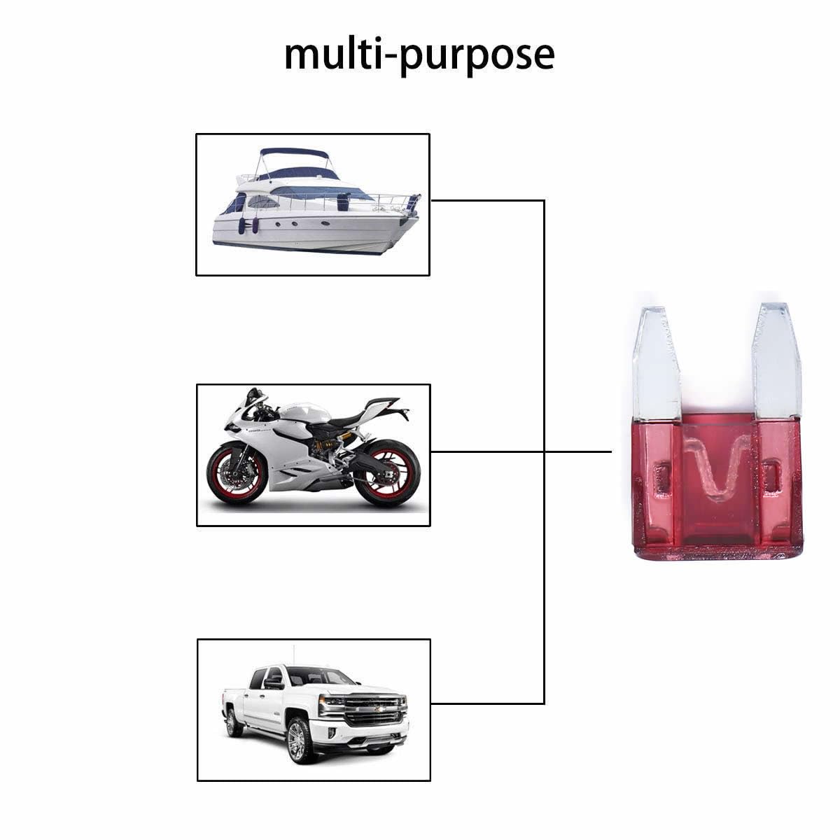 - WIDELY USE - These assorted fuses are specifically designed for Cars, Trucks, SUVs, ATVs, UTVs, Camper RV, Motorcycles, Fleet, Golf Car, Boat, snowmobiles, and most general DC applications etc., covering such components as radio, light, turn signals, etc.