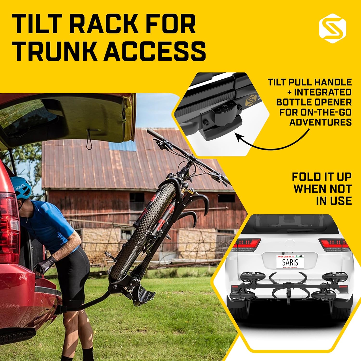 - TILTING FEATURE FOR EASY REAR ACCESS: The rack's tilting mechanism allows access to the rear of the vehicle, even when fully loaded with bikes, and folds up compactly when not in use.