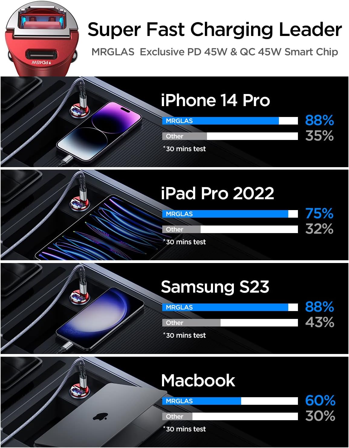 - PD45W+QC45W SUPER FAST CHARGING: MRGLAS 90W car charger adapter fast charging supports PD 45W (USB-C port) and QC 45W (USB-A port) high output, which can fast charge all major mobile phones/tablets at the same time. Allowing iPhone 16 Pro Max and Samsung Galaxy S25 to charge from 0% to 89% in 30 minutes, it helps you save more time on long trips.