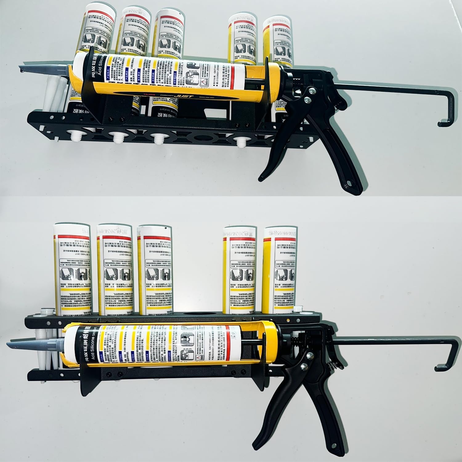 - [High quality] Our Caulking Gun Holder Caulking Gun Storage Rack is made from high quality metal, with a rust resistant coating, so this Wall Mounted Caulk Tools Rack can be using for a long time.