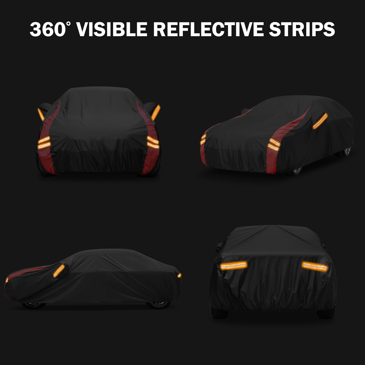 - 【Unique Design】 ① This all-weather waterproof car cover is specially designed to resist strong winds. Three specially designed windproof straps at the bottom pass through the middle of the vehicle to ensure that the cover stays in place. An additional windproof strap at the rear of the car prevents the rear cover from being lifted by the wind. ②Equipped with 6 reflective strips, these full-coverage reflective strips serve as a nighttime reminder to others, ensuring parking safety. perfectly protect your side mirrors and prevent damage.