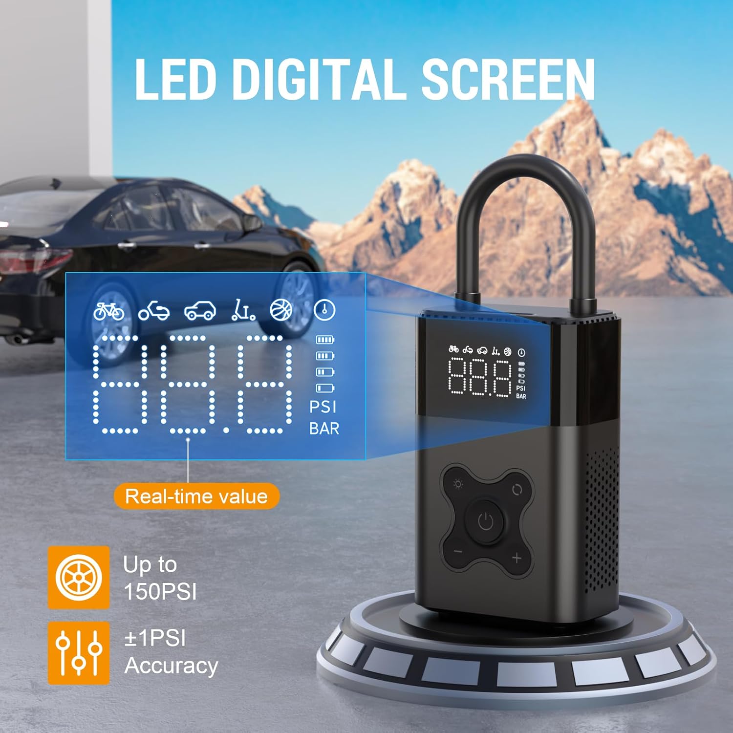 Tire Inflator Portable Air Compressor, 150 PSI Air Pump for Car, Electric Bike Pump with Digital Tire Pressure Gauge, Portable Tire Inflator for Compact Car, Electric Motorcycle, Bike (Black)