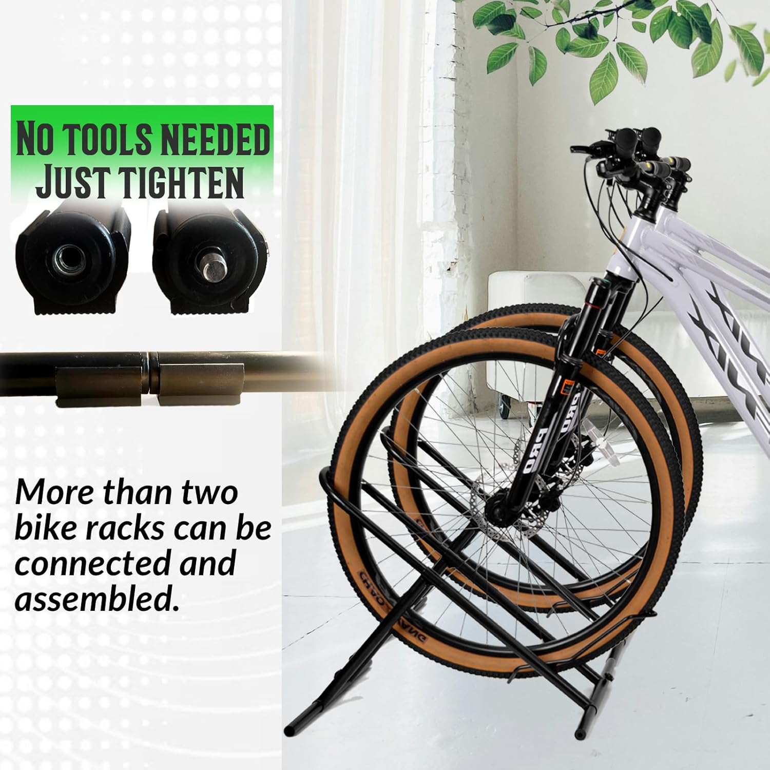 - Versatile Modular Design: This bike rack offers endless possibilities for customization! Equipped with connection pieces, two or more racks can be seamlessly connected to create a stable system. You can also freely adjust the orientation to fit various spaces, whether it’s your garage, apartment, or outdoor area. Tailor the setup to your unique needs and environment—let your creativity shine while maximizing functionality and convenience.