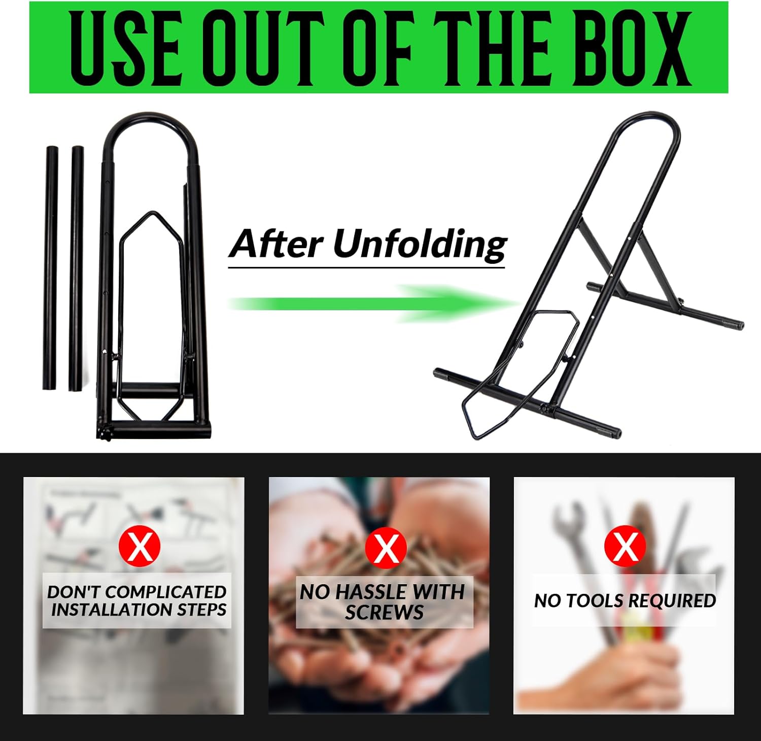 - Easy to Assemble: Skip the hassle of complicated assembly! This bicycle rack is designed for quick and easy setup—no tools required, no need to tighten tricky screws, and no tedious steps. In just minutes, you’ll have a fully functional bike stand, giving you more time to enjoy the convenience of organized bike storage without the frustration of lengthy installation.