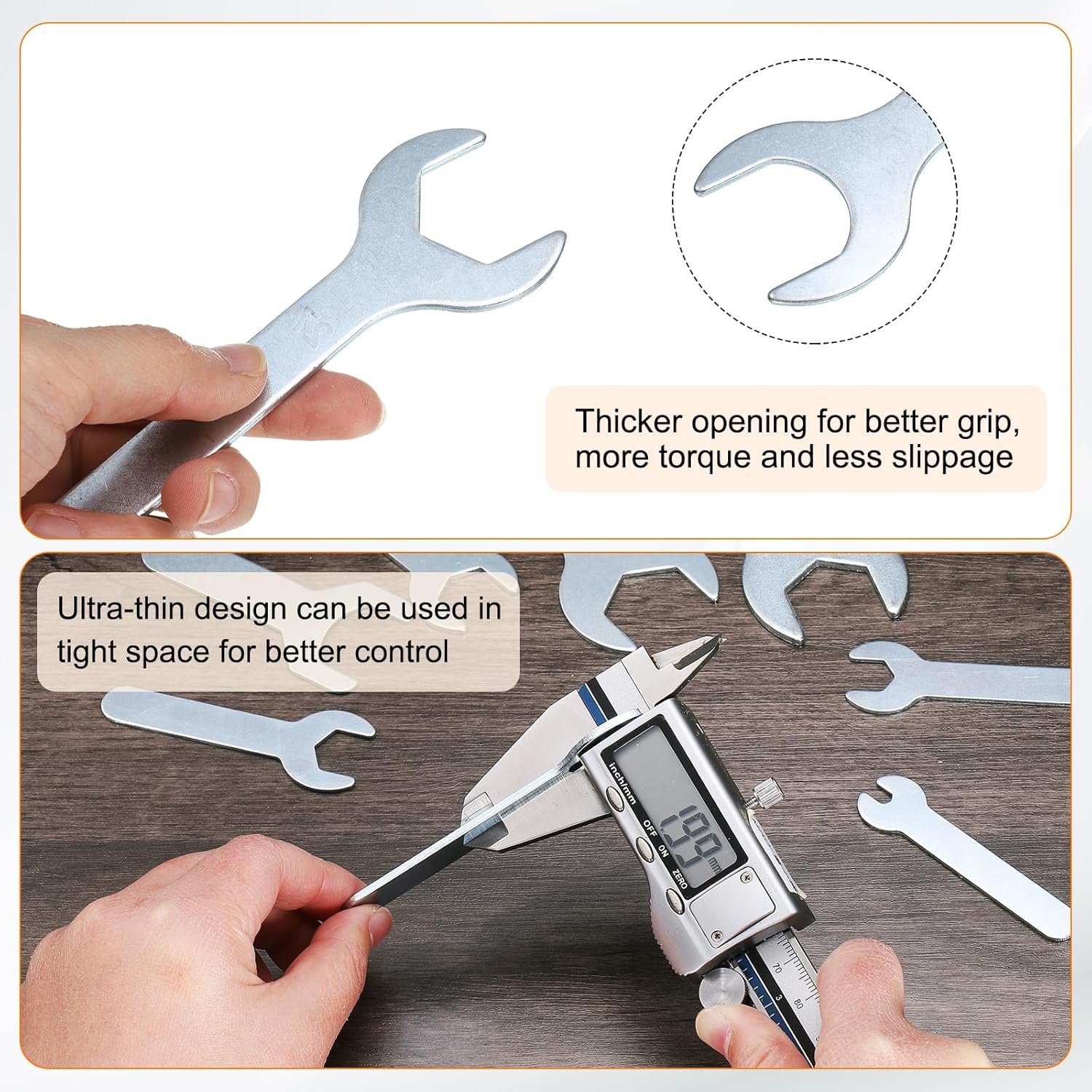 - Standard Size - The standard open-end wrench's increased thickness ensures a more secure grip on nuts and bolts, resulting in better torque transfer and less slippage. The precision socket allows for quick and easy adjustment of the wrench size to accommodate different bolt sizes. The ultra-thin handle is comfortable to hold and improves work efficiency.
