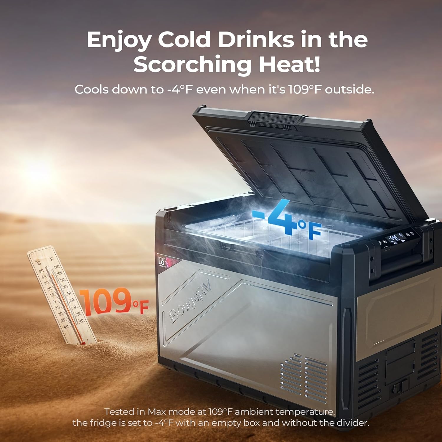 - Capable of Reaching -4℉ Even at 109℉ Ambient Temp: Using a 5.7cc compressor, the Rocky V2.0 55 quart portable refrigerator can cool down to -4℉ even in an ambient temp of 109℉, ensuring that frozen goods stays as fresh as possible even in hot environments and let you have a better outdoor experience