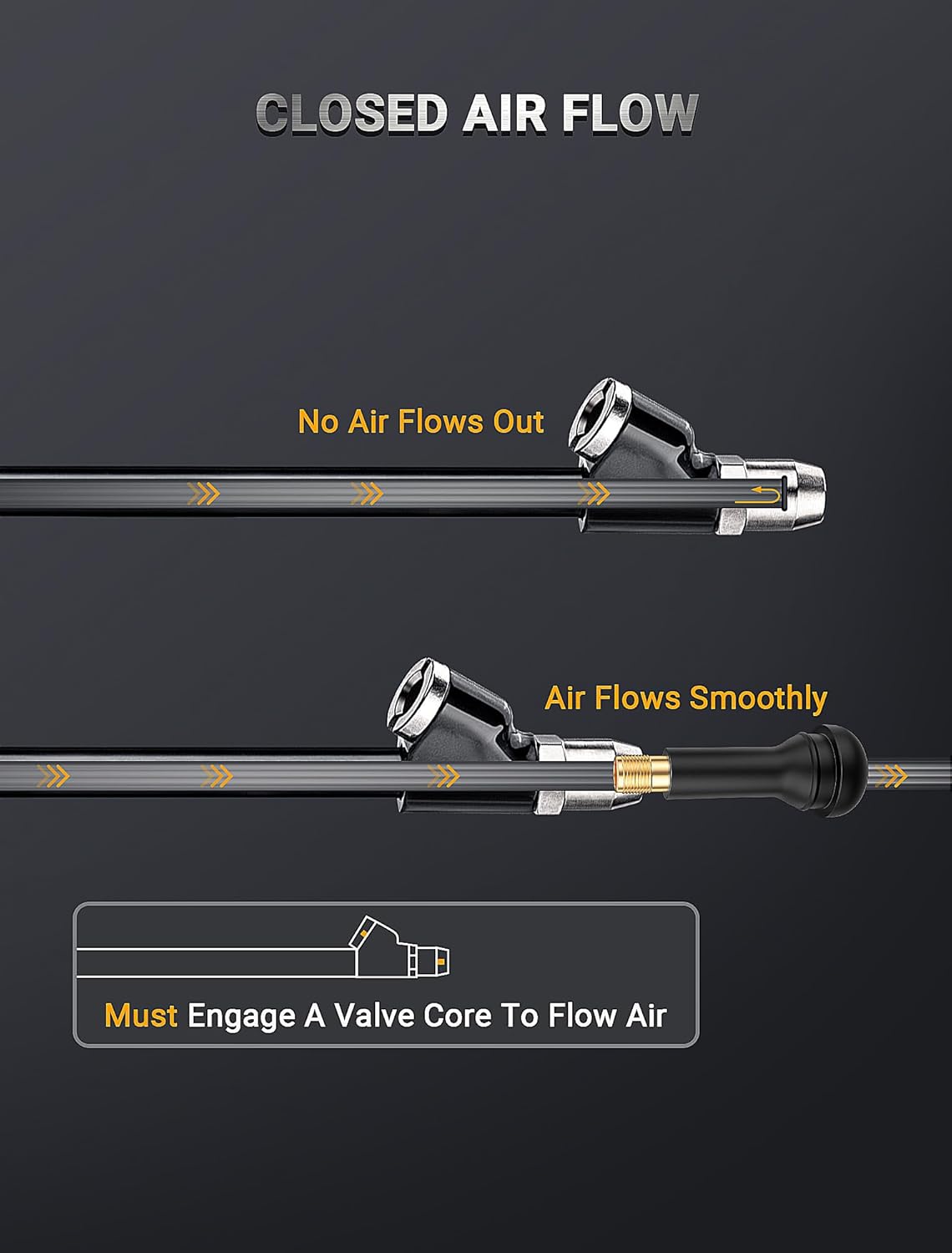 - 【CLOSED FLOW & LEAK FREE】This lock on air chuck enables the shut-off valve to shut down the air flow when the stem is not opened, air only passed when engaged with a tire valve. Both ends securely fit onto the leak-free valve core threads, quickly lock on to the tire valve stem with a simple push or pull with no air leaking.