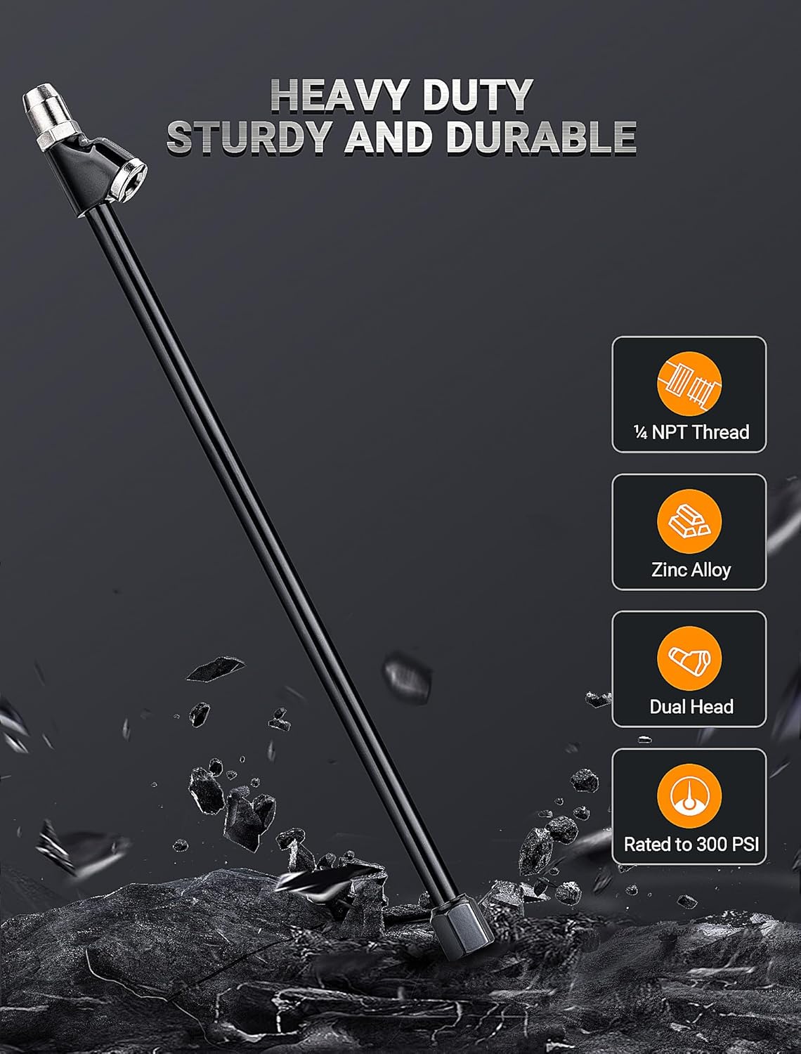 - 【EXTENDED REACH DUAL HEAD】LUMITECO 13 inch lengthened air chuck is designed with the integrated straight foot air chuck and 30°reverse chuck. Straight head air chuck for inner/single wheels or hard-to-reach valves, and 30° reverse angle chuck for outer wheels. Perfect for dually tires on trucks, RVs, trailers and more.