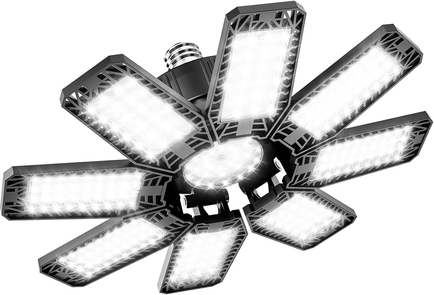 - Adjustable Beam: LED garage light can be folded 8 panels + 1 central panel design, supports 0-90° angle adjustment, and achieves 360° full-angle lighting. This is exactly what you are looking for to solve the uneven lighting of traditional 3-6 blade garage lights