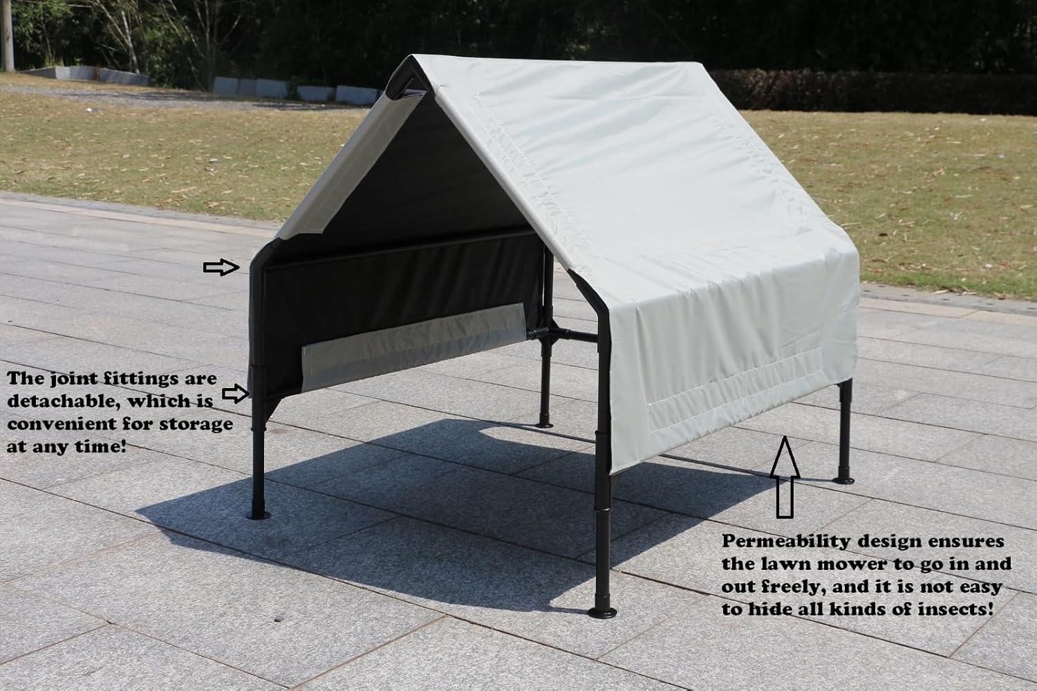 - The overall design is very simple, which makes it easy to integrate the robot mower garage into your overall garden design. The white roof is like a camping tent of a lawn mower, which makes the whole garden more natural. The robot mower can easily enter the shelter from the side to recharge or protect itself from the rain. This design helps to protect it from bad weather. This will help protect your robot mower from overheating and moisture accumulation and extend its service life.