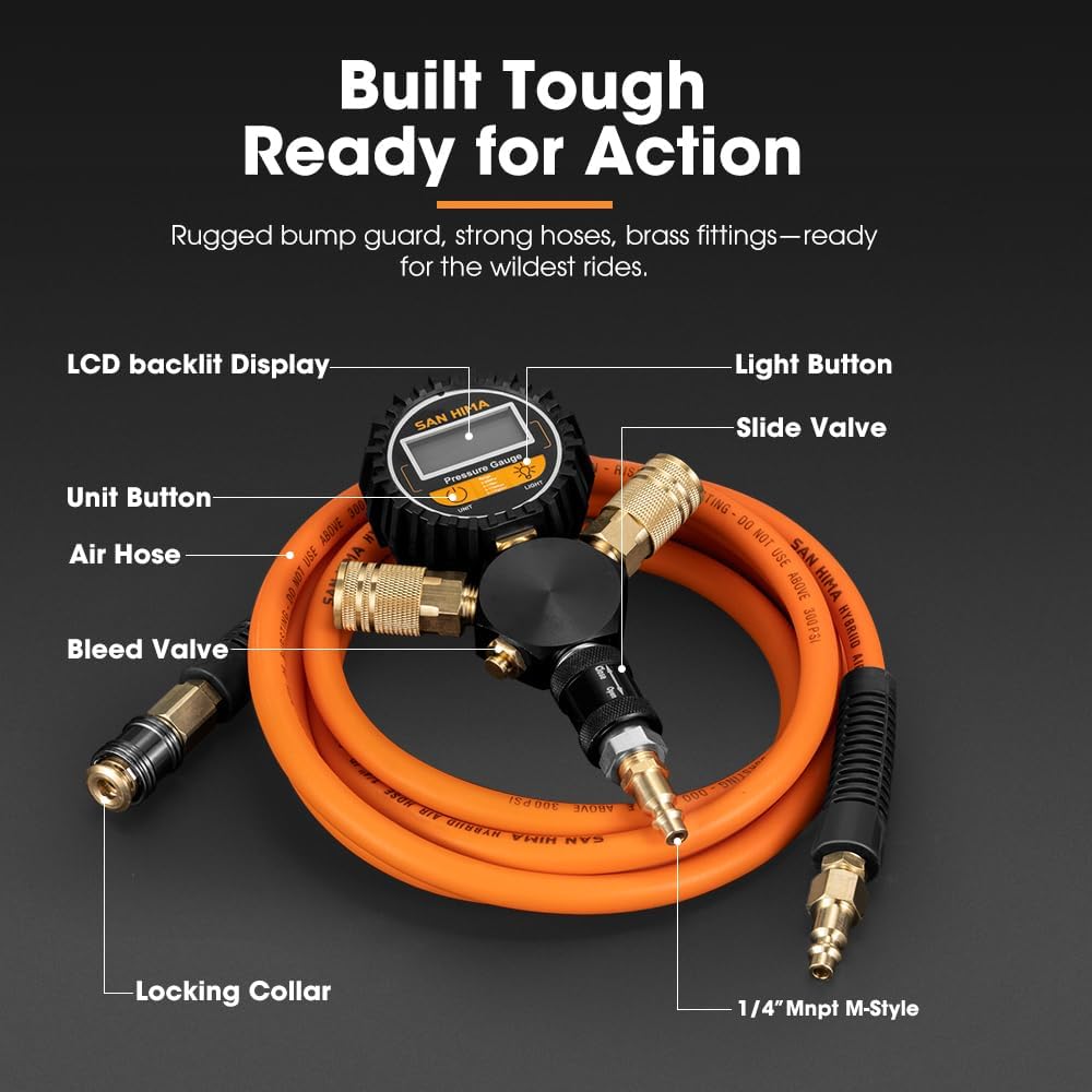 - Dual Tire Domination for Any Terrain: Inflate or deflate two tires simultaneously for perfectly balanced pressure in half the time. With a versatile 0-250 PSI range, this kit allows you to fine-tune the exact pressure you need—whether you’re tackling soft sand, rugged rocks, or muddy trails. Built for off-road adventurers, it ensures optimal traction and efficiency on every journey.