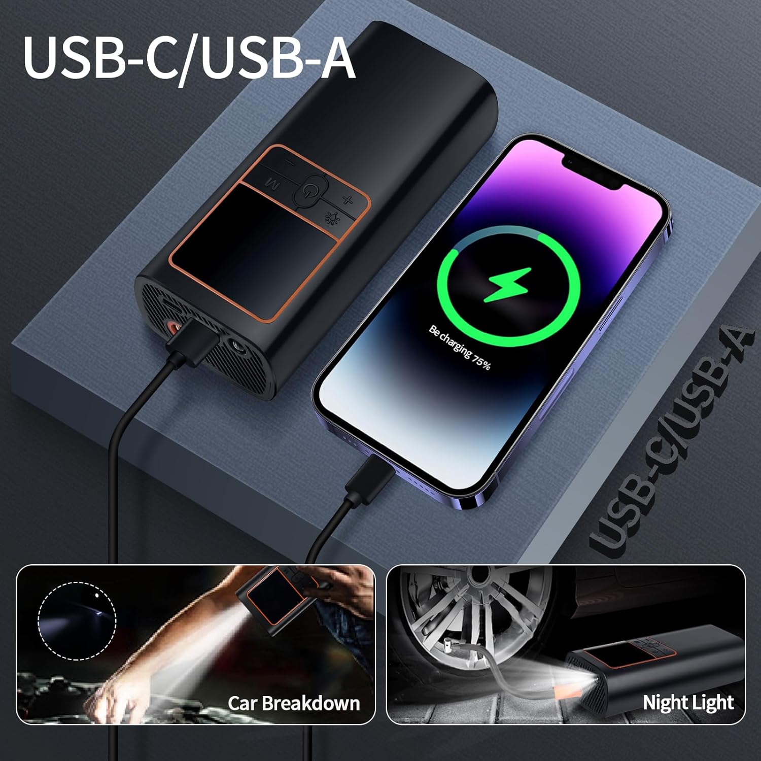 - 【Tire Inflator Air Compressor】Lightweight air pump,USB-C input port and USB-A output port, can be reversed to power. A suitable gift for Father's Day, Christmas, New Year and other.