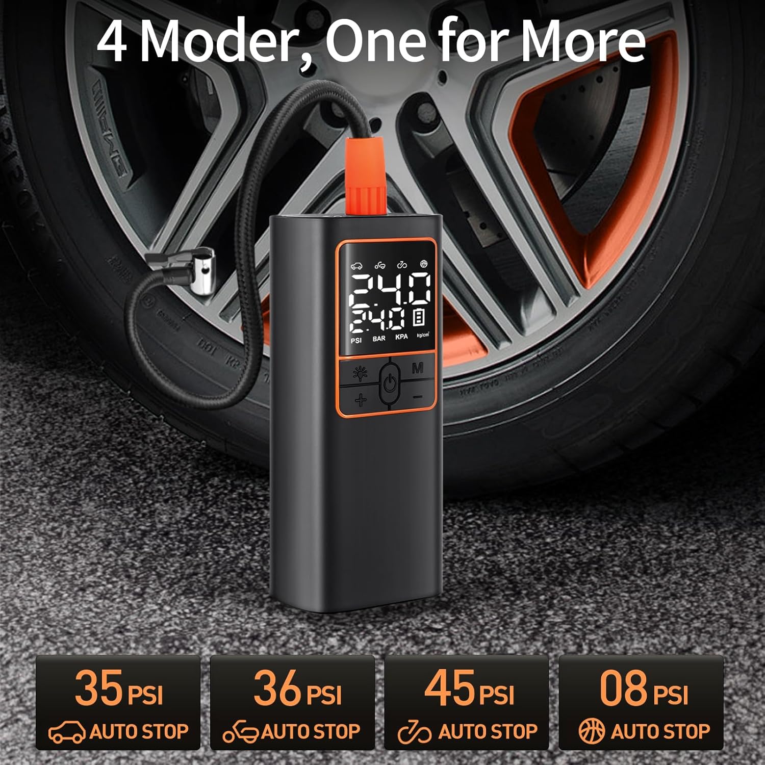 - 【Dual Display & 4+N Smart Modes】4 preset modes for bicycle, motorcycle, car and ball, auto shut-off when the preset value is reached, You can also set your own pressure value up to 150PSI to meet the inflation needs of more inflatables. One button to easily switch between PSI, BAR, KPA, kg/cm² pressure units,Easy to operate