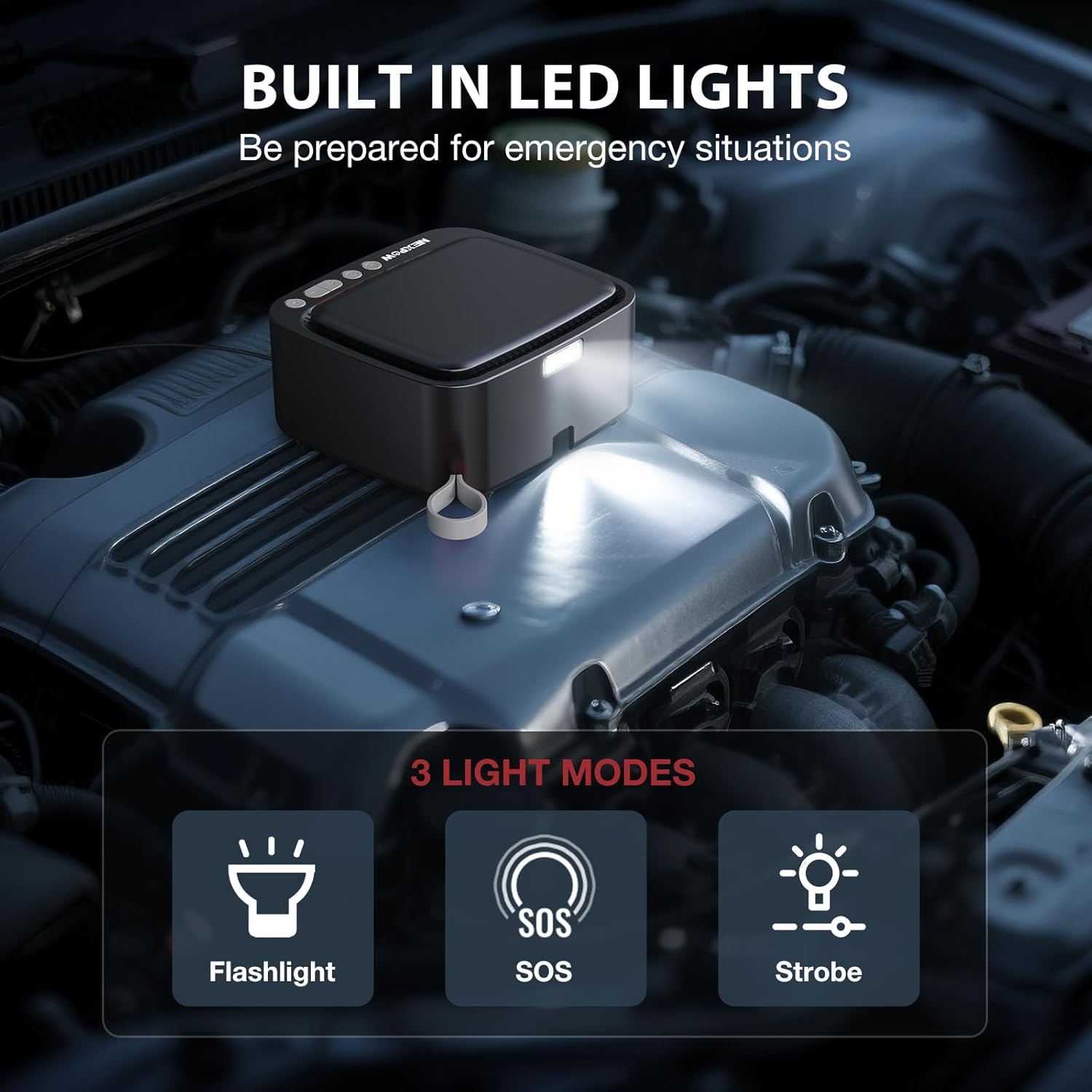 - EMERGENCY LIGHTING AND DUAL DIGITAL DISPLAY: This portable car air pump is equipped with three modes of LED lights (flashlight, SOS, and strobe light) for easy inflation, tire replacement, or signaling to other vehicles at night. At the same time, this tire inflator is equipped with dual digital displays that can display real-time and preset pressure values. Through precise pressure control and monitoring, it eliminates guesswork, ensures safe inflation, and provides a convenient experience.