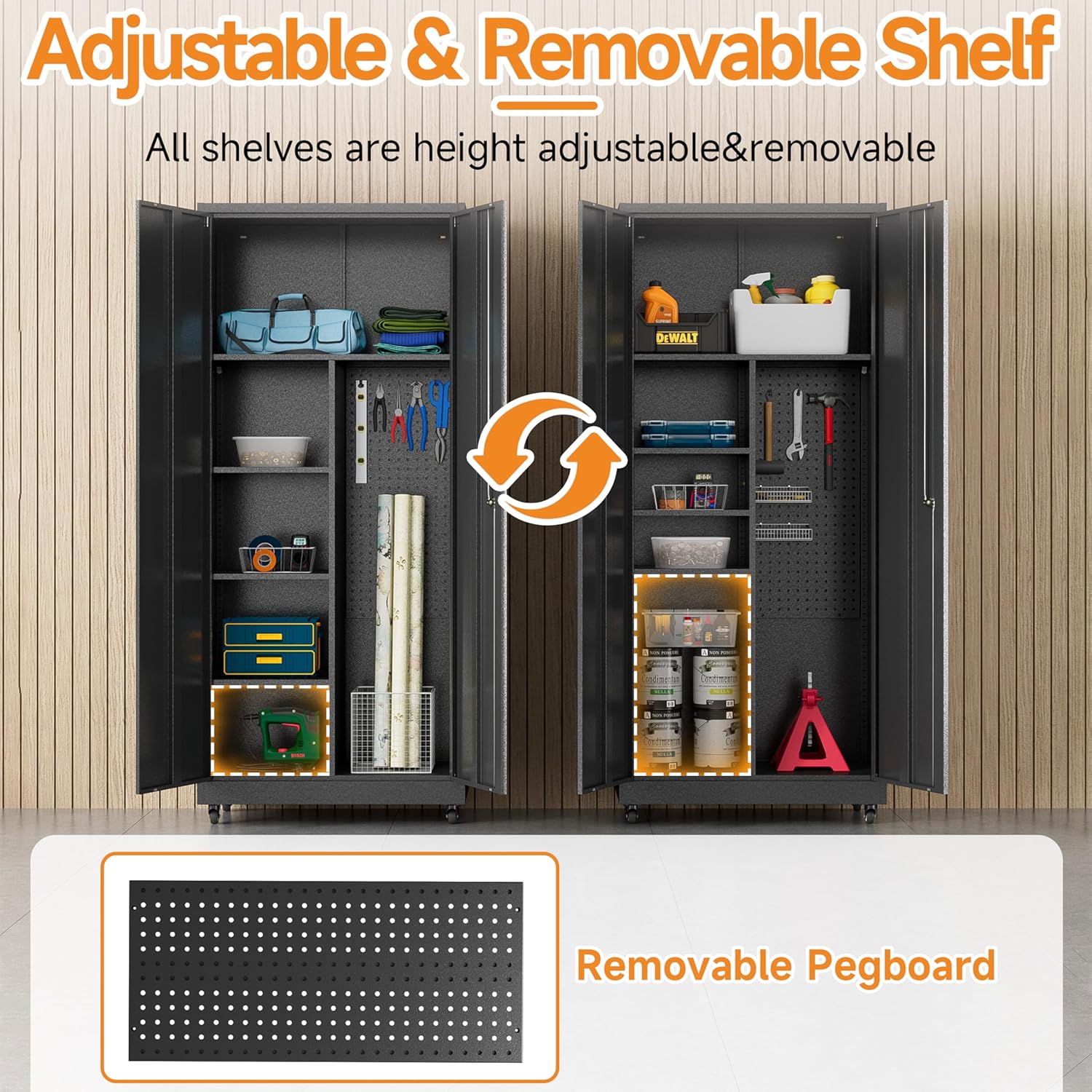 - 🛠️【Ample Storage Space with Customizable Layout】Offering more storage than traditional cabinets, this garage storage cabinet features adjustable and removable shelves to fit tools of any size and a portable pegboard that detaches for on-the-go organization, tailored to your specific needs.