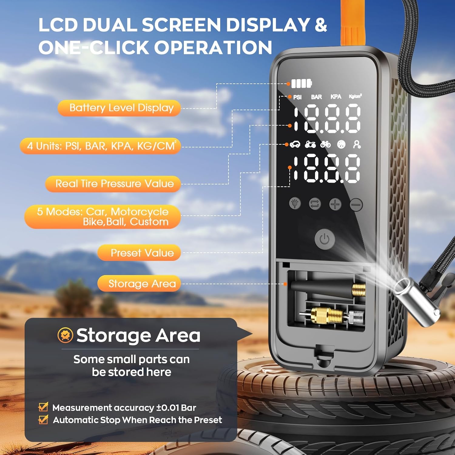 - [PRECISION LCD DUAL SCREEN] The electric air pump featuring a high-precision pressure sensor and dual LCD screens. The real-time display shows both current and target pressure values with ±1% accuracy, ensuring perfect tire pressure every time. Beyond inflation, this car air pump doubles as a power bank with its built-in Type-C charging port and output, it also includes LED light serves as an emergency illumination source. It's your all-in-one solution for smart inflation and emergency power needs.