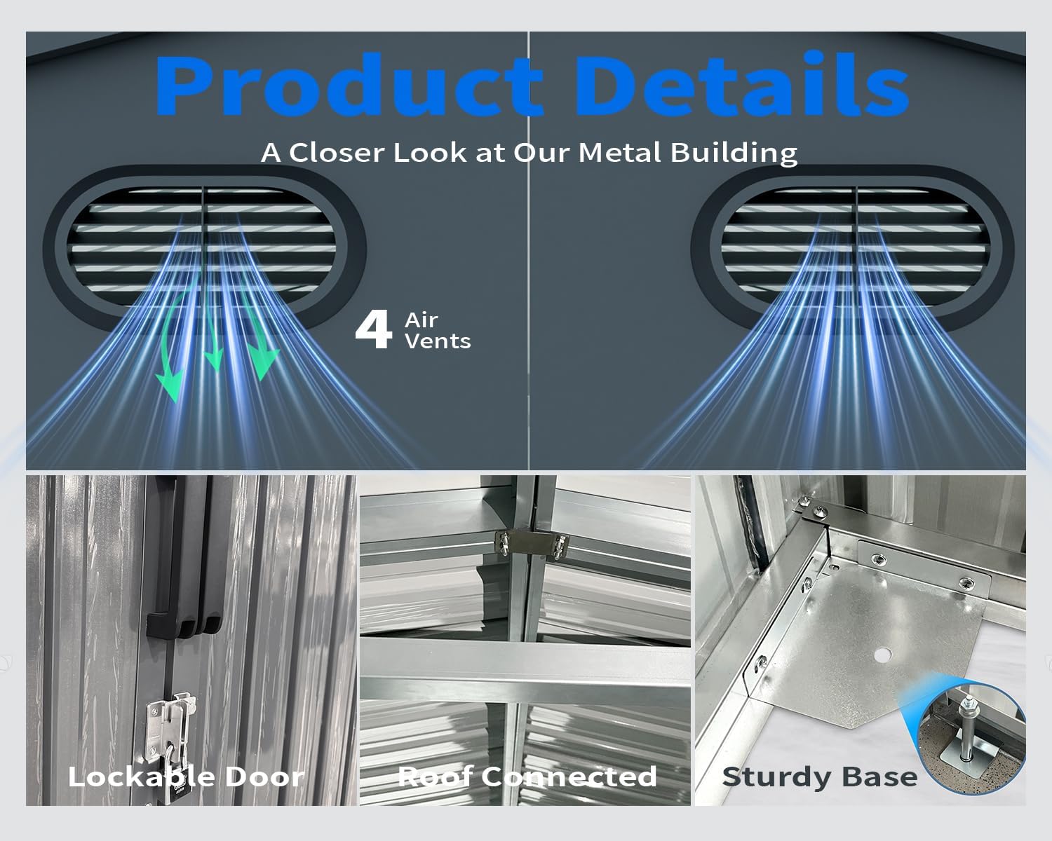 - 🏡 All-weather Protection: Designed for all seasons, this large metal shed features a sloped roof to prevent water or snow buildup. With 4 vents for improved airflow, your tools stay in great condition. The lockable doors, sloping roof, and hidden storage space help minimize odors and reduce moisture.