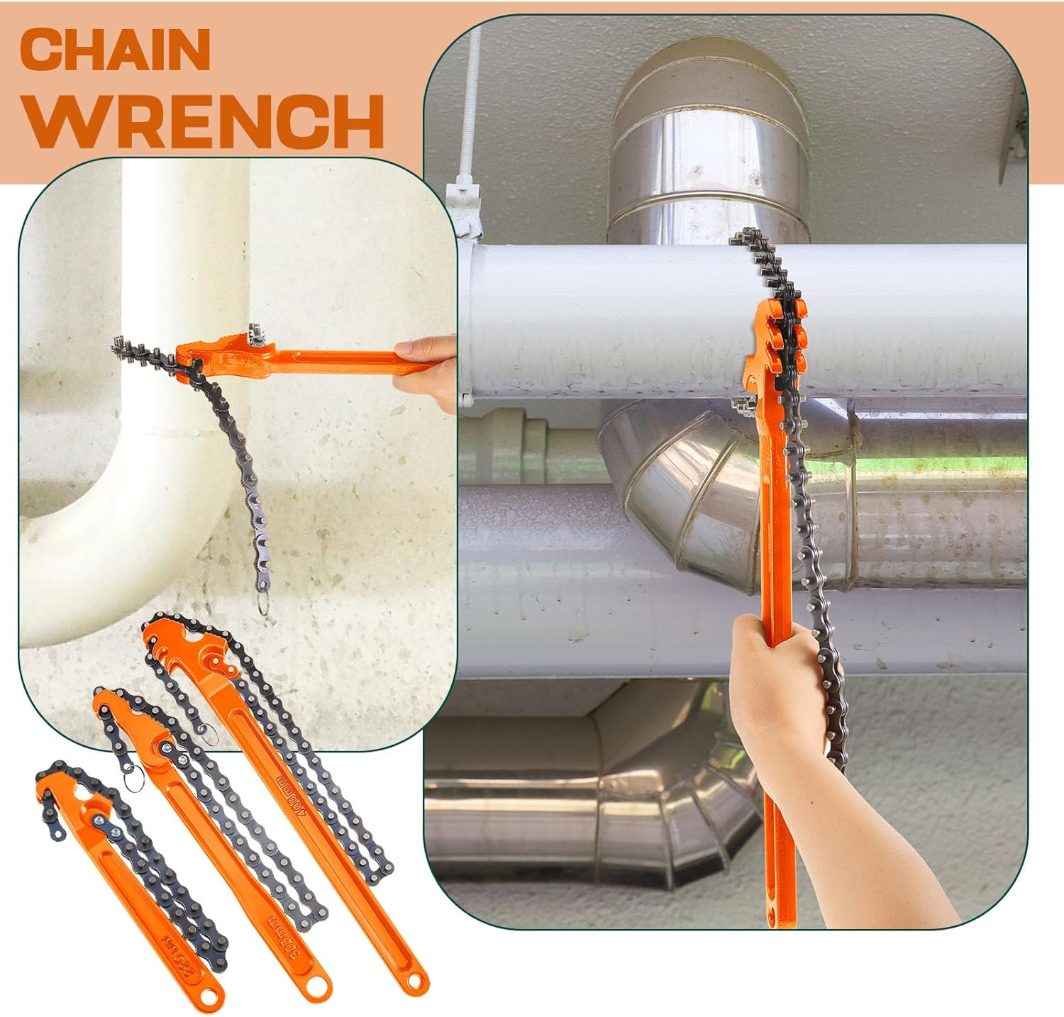 Lasnten 3 Pcs Large Reversible Chain Oil Filter Wrench with 12 16 9 Inch Chain Wrench Adjustable Heavy Duty Carbon Steel Sturdy Pipe Fitting Tool Spanner for Ratcheting Universal(Orange)